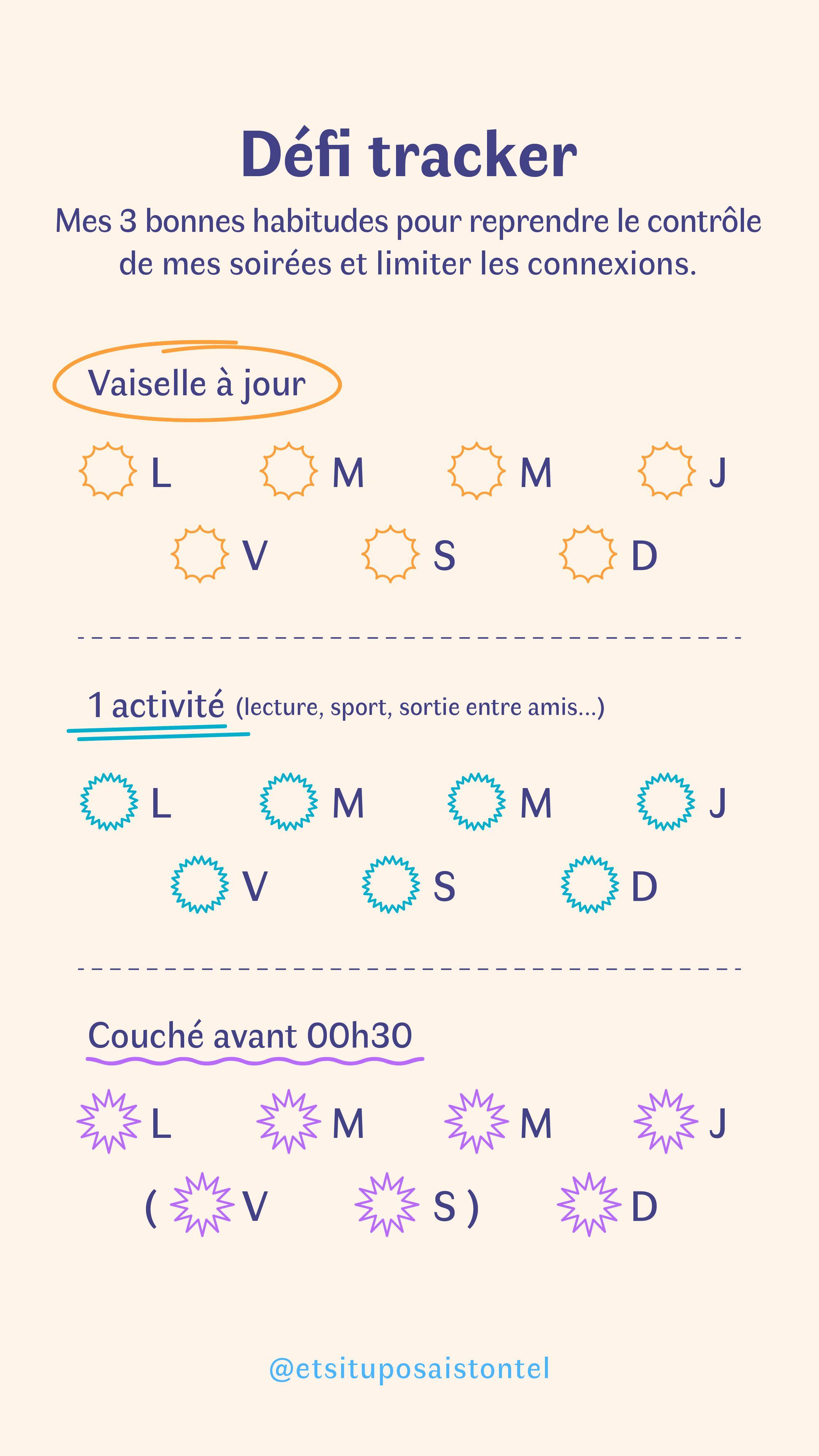 Remplissez les zones blanches pour y insérer vos objectifs pour être une meilleure version de vous même hors des écrans.